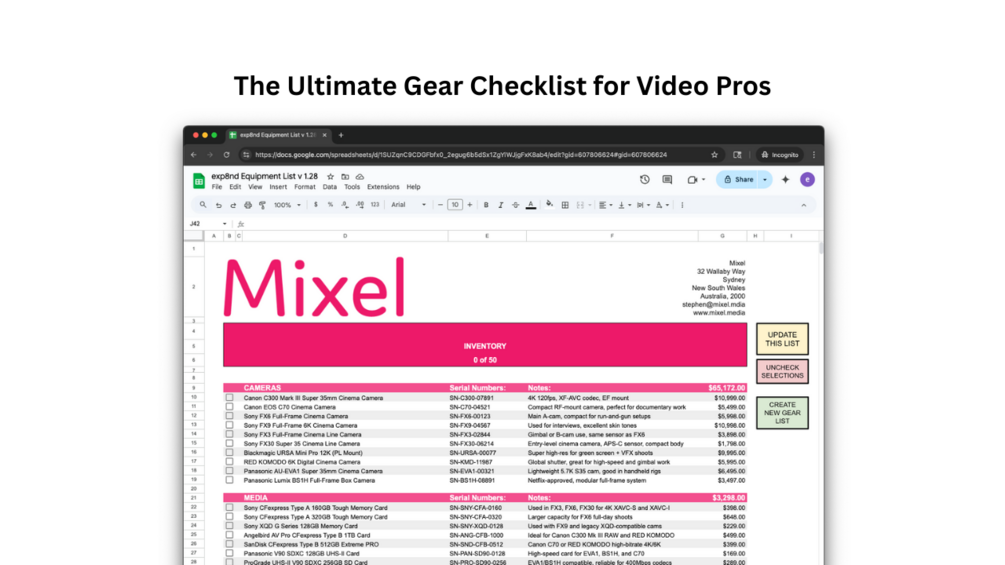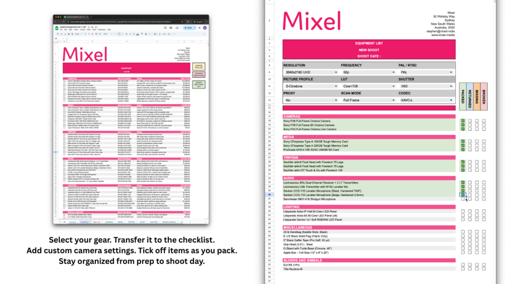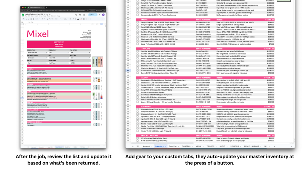 A smart, customizable gear list built in Google Sheets for video professionals to plan, track, and manage equipment with checkboxes, notes, serials, URLs, and auto-generated gear sheets. Add your own logo and colors, organize gear under any headings, and use it for any size production — from solo shooters to full crews.
